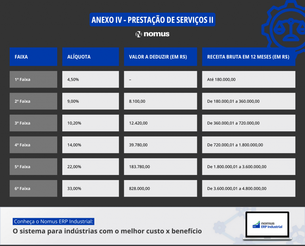 Anexo IV – Prestação de Serviços – Serviços advocatícios, serviços de vigilância, limpeza ou conservação, construção de imóveis e obras de engenharia em geral, inclusive sob a forma de subempreitada e execução de projetos e serviços de paisagismo, tal como decoração de interiores