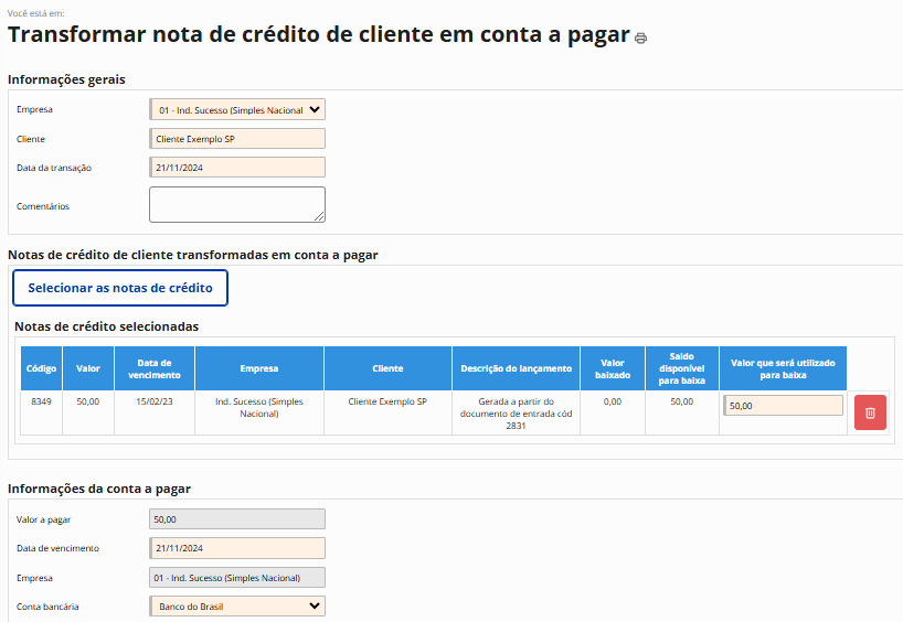 Logo, transformar as notas de crédito em adiantamento permite fazer a conversão de valores e operações de forma rápida, com apenas alguns cliques.