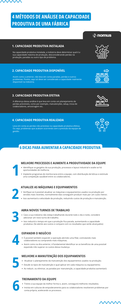 Na capacidade produtiva instalada, a indústria deve determinar qual é a sua capacidade máxima de produção, desconsiderando perdas na produção, paradas ou outro tipo de problema.