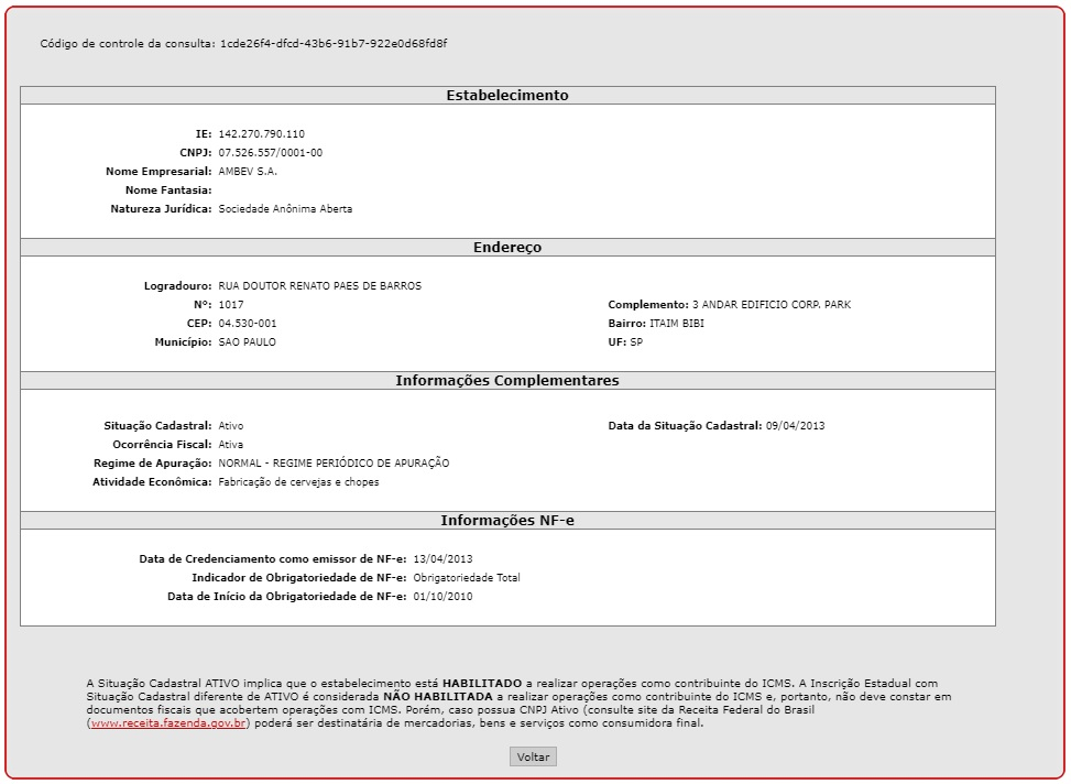 Após clicar em “Consultar” será apresentado o cadastro da inscrição estadual do contribuinte. Na imagem abaixo é possível ver a IE “142.270.790.110”.