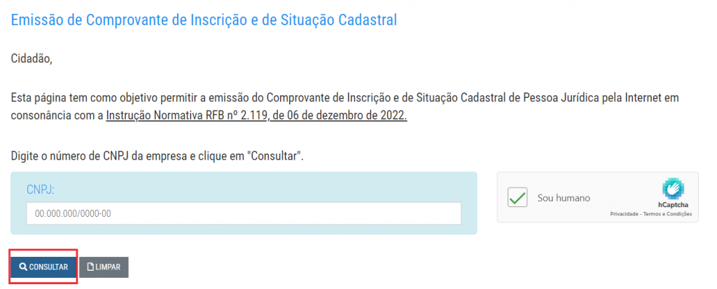 5º Logo abaixo do campo de preenchimento de CNPJ, clique em CONSULTAR: