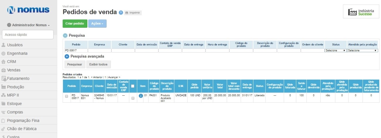 Com a Engenharia de seus produtos já configuradas (lista de materiais e roteiro de produção ) você pode iniciar o registro dos pedidos de venda. Neste caso, vamos considerar o pedido “PD 00617” de 100und do Produto “PA001”.