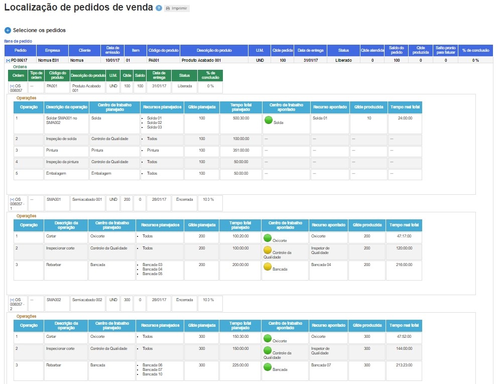 À medida que os apontamentos são registrados o relatório de localização de pedido de venda é atualizado. Ao visualizar o relatório dessa forma, as informações que o sistema estará passando serão:
