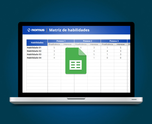 Na primeira coluna, chamada “Habilidades”, serão listadas as habilidades, competências, enfim, soft e hard skills. Depois, para cara colaborador, você deve criar duas colunas, uma chamada “Proeficiência” e outra “Interesse”, encabeçadas por células mescladas com o nome do colaborador.