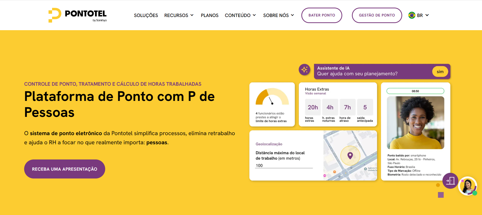 Com grandes clientes como XP Investimentos, Uber e Senac, a Pontotel é uma plataforma de controle de ponto digital e gestão de jornada, com registro via app e web, tratamento de ponto, banco de horas/horas extras e relatórios para DP/RH