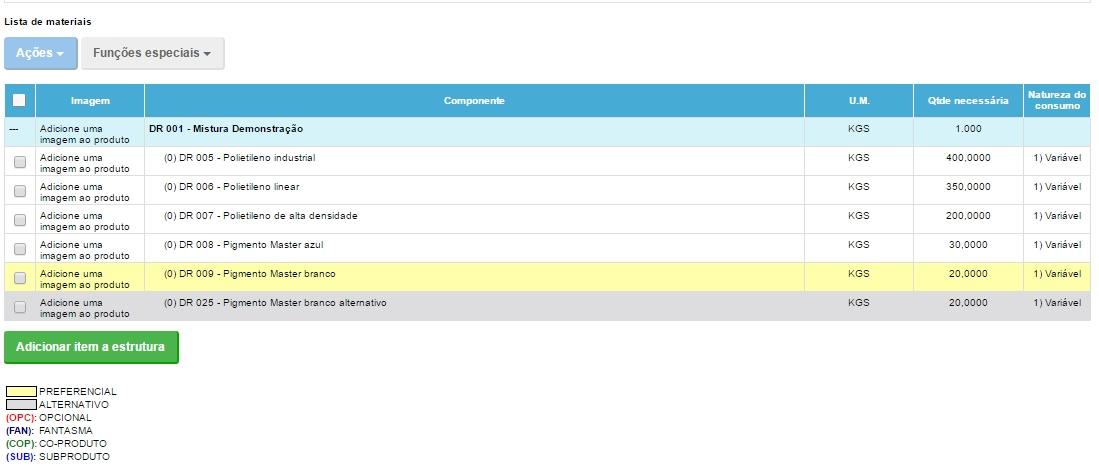 Neste exemplo vemos produtos com fundo branco, amarelo e cinza. Os produtos com fundo branco são produtos preferenciais e que não possuem qualquer alternativo para substituí-los. Já o componente com fundo amarelo “DR 009 – Pigmento Master branco” é um componente preferencial e que possui um alternativo, localizado logo abaixo dele com fundo cinza (DR 025 – Pigmento Master branco alternativo) .
