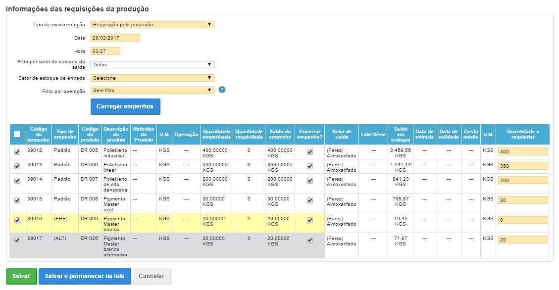 Na imagem acima podemos verificar que o componente preferencial “DR 009 – Pigmento Master branco” possui saldo em estoque 10,45Kg , enquanto o seu alternativo possui saldo de 71,87Kg . Como a necessidade é de 20Kg tanto para o preferencial quanto para o alternativo, se utilizarmos o produto preferencial o seu saldo não é suficiente para atender a demanda da ordem. Portanto, neste caso, o ideal seria requisitar o seu alternativo que possui quantidade em estoque suficiente para atender a produção.