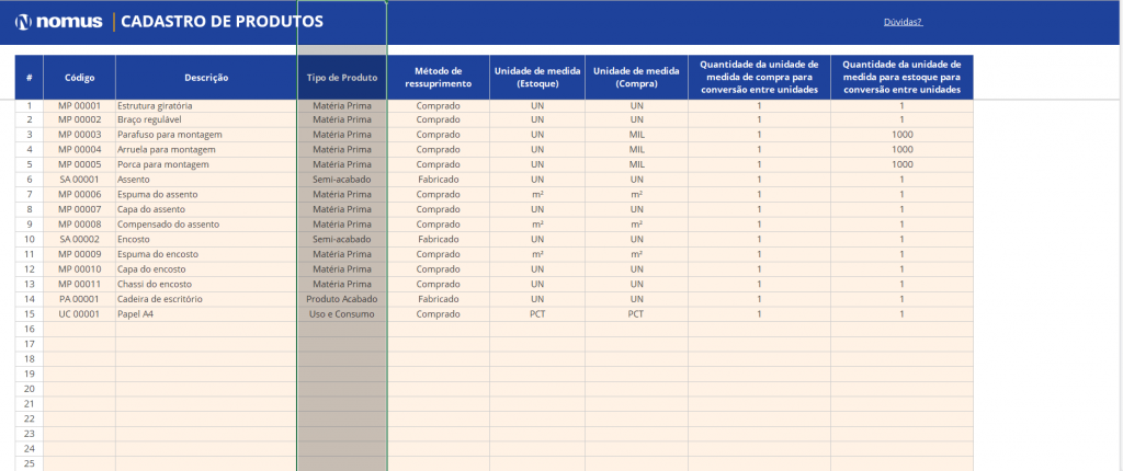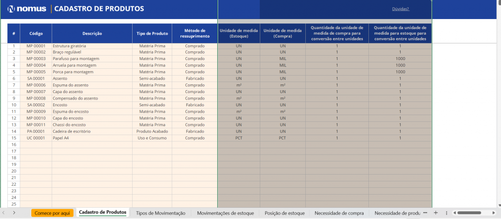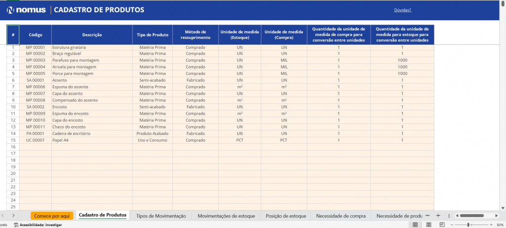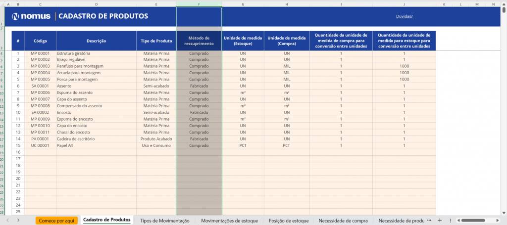 A planilha de controle de estoque é muito simples de usar e os passos fáceis de se entender. Ela fará toda a diferença na sua indústria e a maior parte do trabalho vai ser só o cadastro correto dos produtos na planilha.