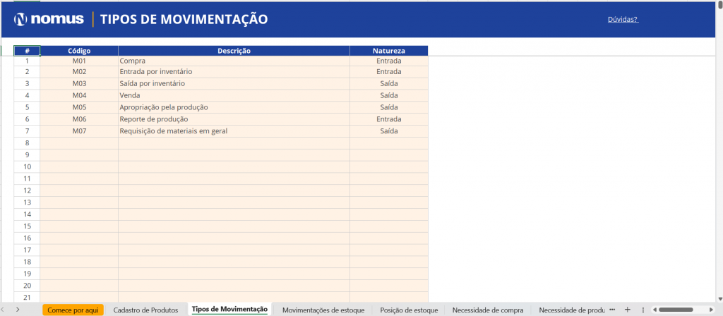 3. Após o cadastro das planilhas, abra a tela de movimentações. Você verá que já há 7 movimentações cadastradas, que são as normalmente usadas pelas indústrias. Se você tiver outra para usar, cadastre conforme o padrão: