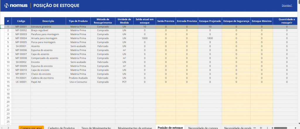 5. Agora, vamos conhecer a aba de posição de estoque. Ela serve como relatório que traz seu estoque atual, saídas previstas, entradas previstas, estoque projetado etc. Tudo o que você cadastrar na aba de movimentações de estoque, impactará na aba de posição de estoque. Veja a tela e também experimente na planilha: