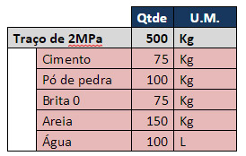 Não sou Engenheiro civil nem tenho qualquer conhecimento das proporções e técnicas de composição para formação dos traços,portanto, peço desculpas aos catedráticos no tema se o meu traço ficar totalmente fora de padrão. Mas, dentro do exemplo apresentado, são formados 500Kg de “Traço 2MPa” com a utilização de todos esses produtos nas respectivas quantidades .