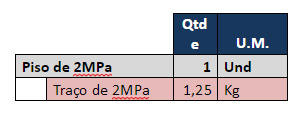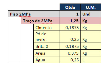Vamos seguir com o exemplo da fábrica de concretos. Imagine que a composição do traço com resistência de 2MPa seja a seguinte: