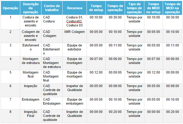 Todas essas atividades são muito rápidas, feitas pela mesma pessoa e em sequência, ou seja, criar todas essas ações como operações do roteiro do produto representa um preciosismo que não vai trazer muito benefício para a gestão da sua fábrica, a não ser que a atividade de Cortar rebarba do filme plástico que protege o assento/encosto seja primordial para todo o seu planejamento de produção. Caso ele ou qualquer uma dessas atividades não representem, individualmente, muita representatividade nos resultados da produção, você pode criar uma operação única e controlar o tempo de produção de todas essas ações dentro dela.