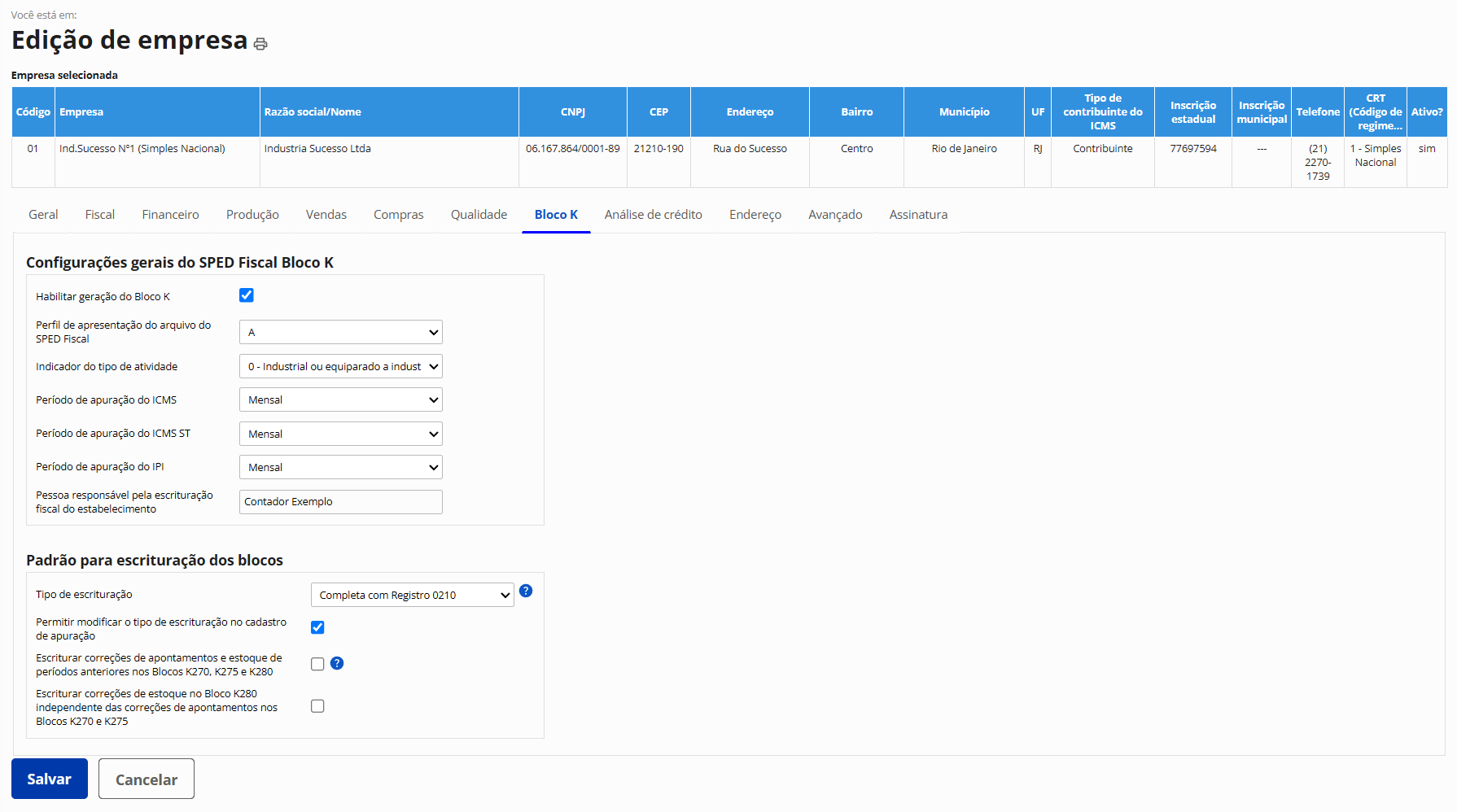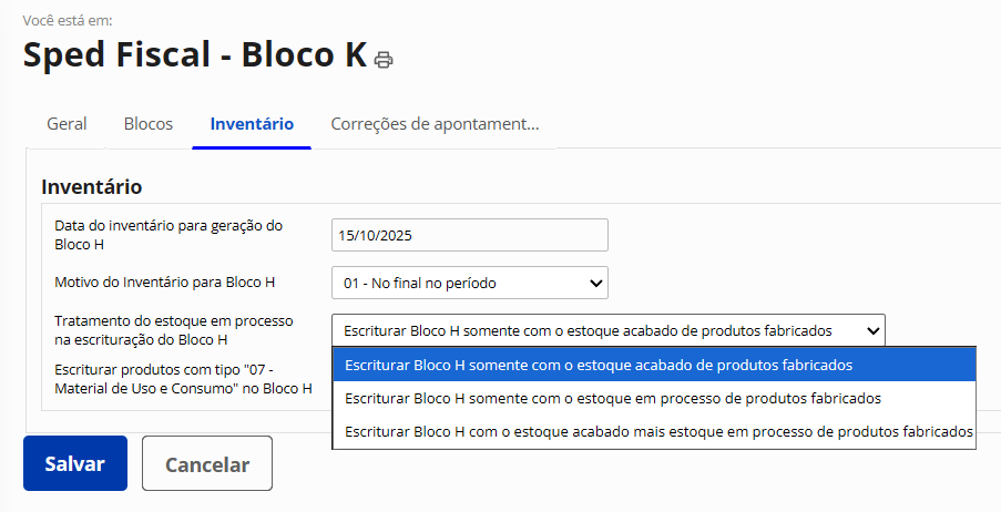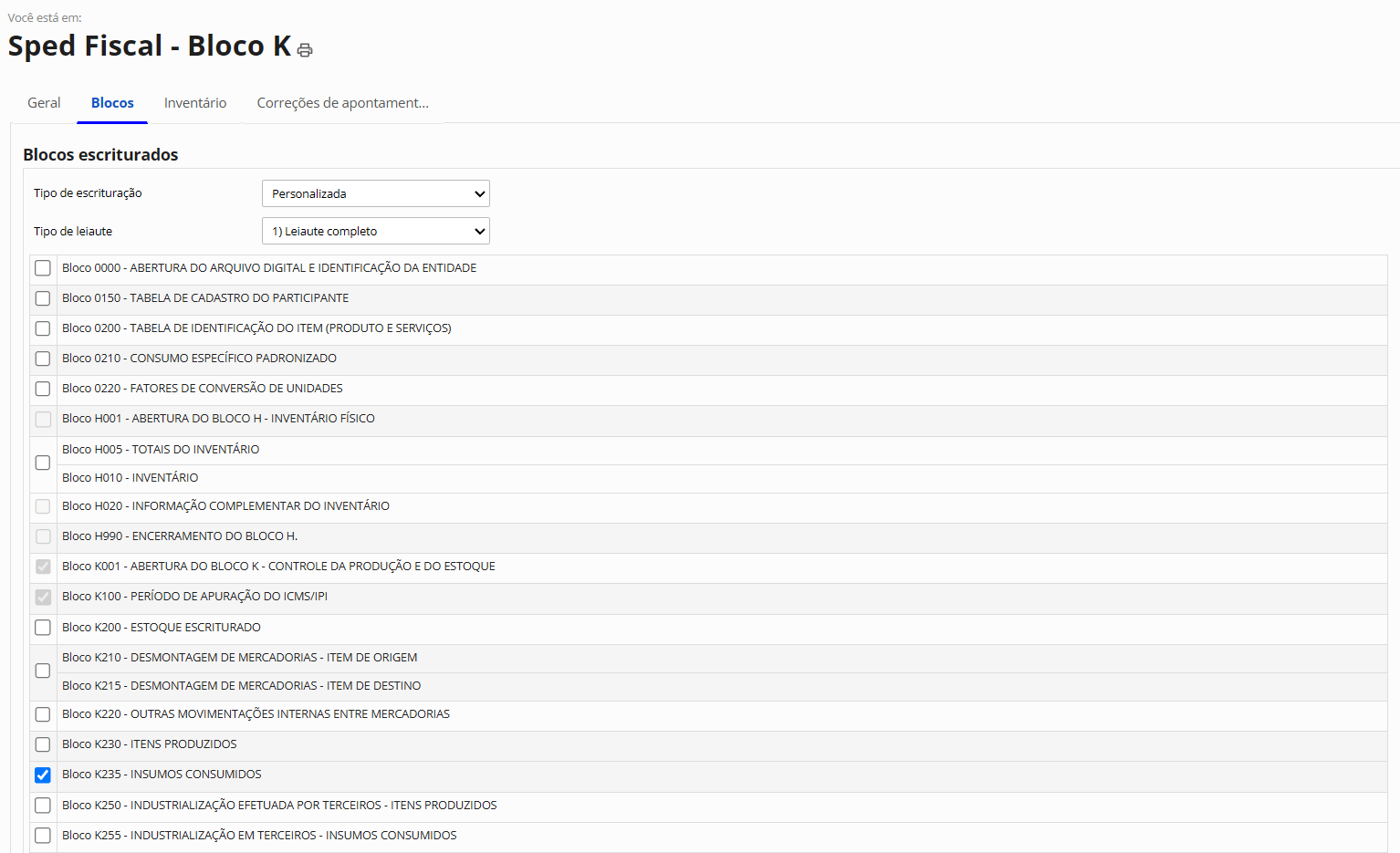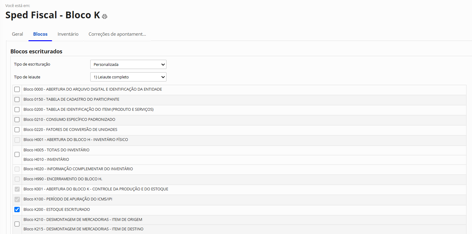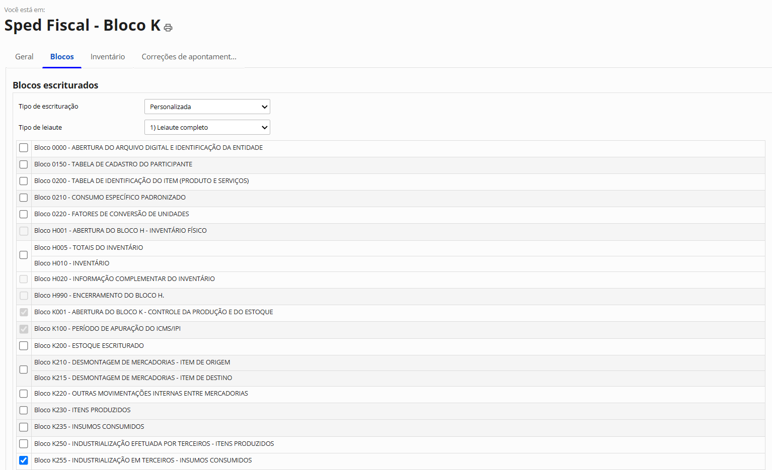 Geração do Bloco K do SPED Fiscal integrado ao controle da produção, controle de estoque, controle de estoque em poder de terceiros e controle de estoque de terceiros em nosso poder.