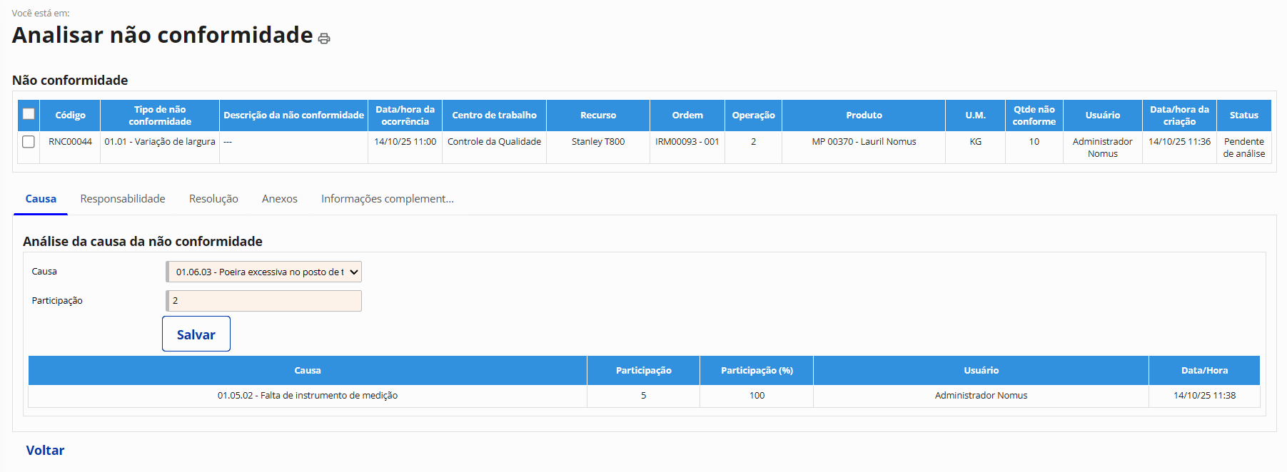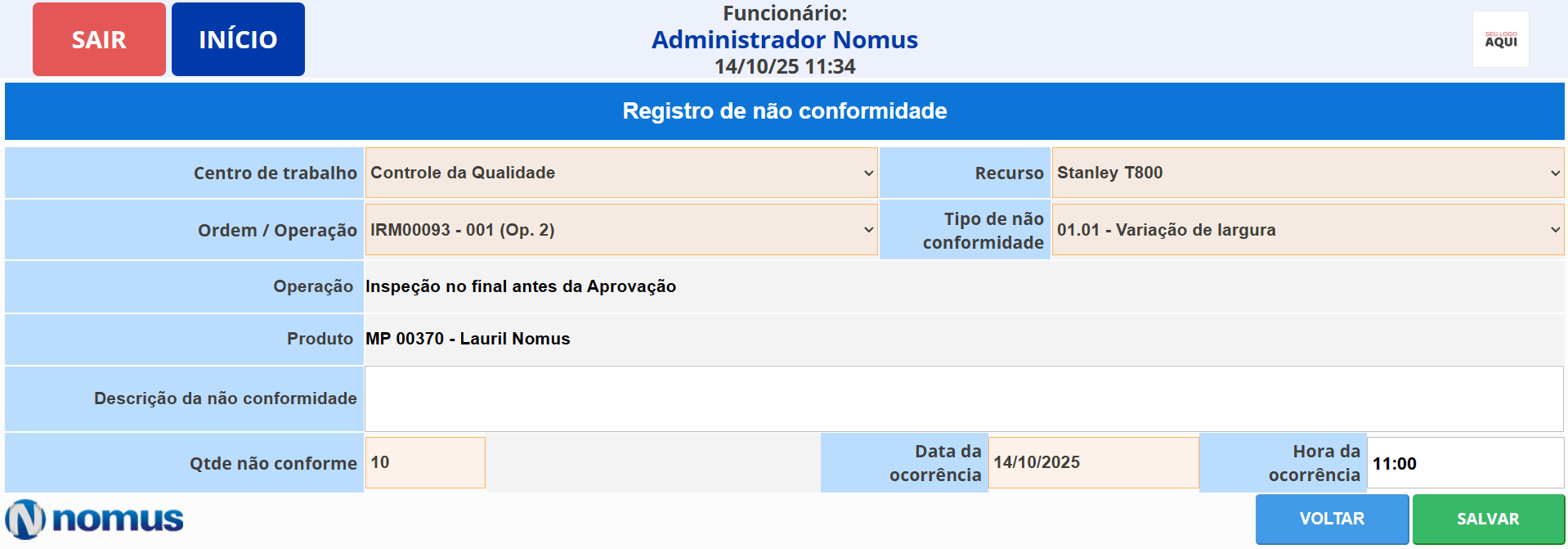 Registre todas as não conformidades detectadas na fabricação dos produtos. Se necessário, é possível utilizar terminais de apontamento no chão de fábrica para fazer estes registros.