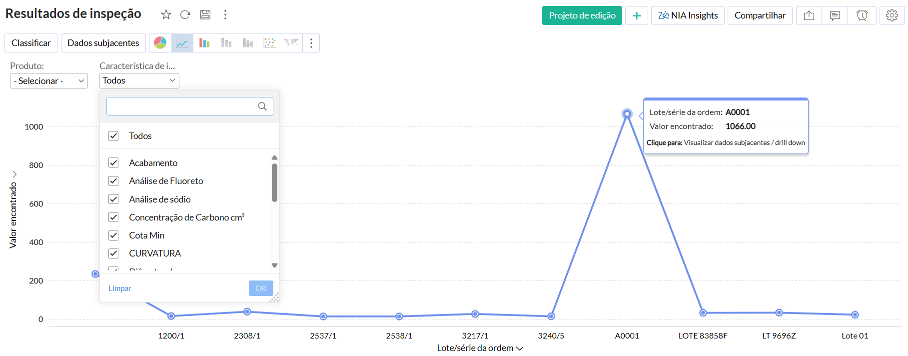 Monitore indicadores de não conformidades por produto, tipo de produto, tipo de defeito, cliente e causa raiz. Monitore o processo de inspeção comparando os desvios entre os valores ideais especificados e os resultados de inspeção.