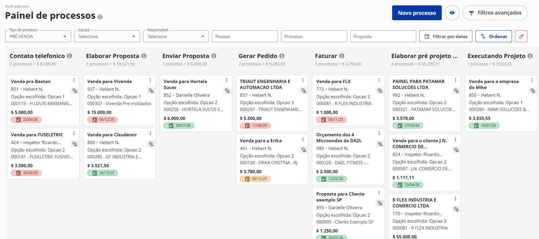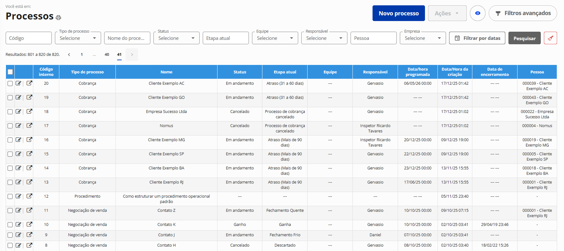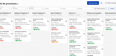 Acompanhe o andamento de processos por etapa. Por exemplo, o processo de negociação de venda pode ter as etapas: Pré-venda, Apresentação Agendada, Apresentação Realizada, Aguardando Fechamento, Negociação Ganha e Negociação Perdida.