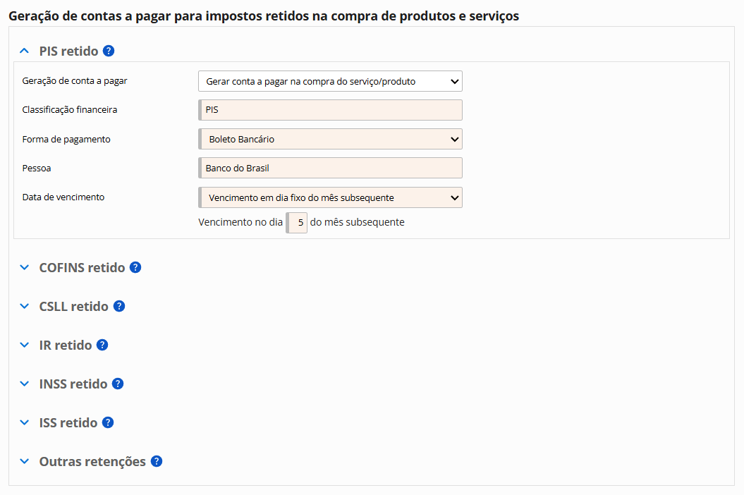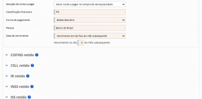 Possibilidade de geração de contas a pagar para impostos retidos na compra de serviço, como PIS, Cofins, IR, INSS, ISS, CSLL e outras retenções.