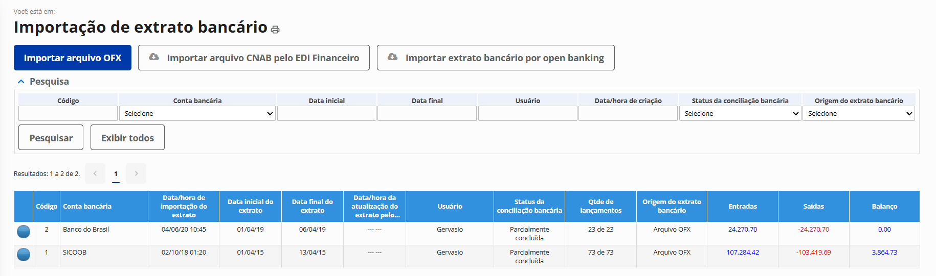 Importação de extratos dos bancos