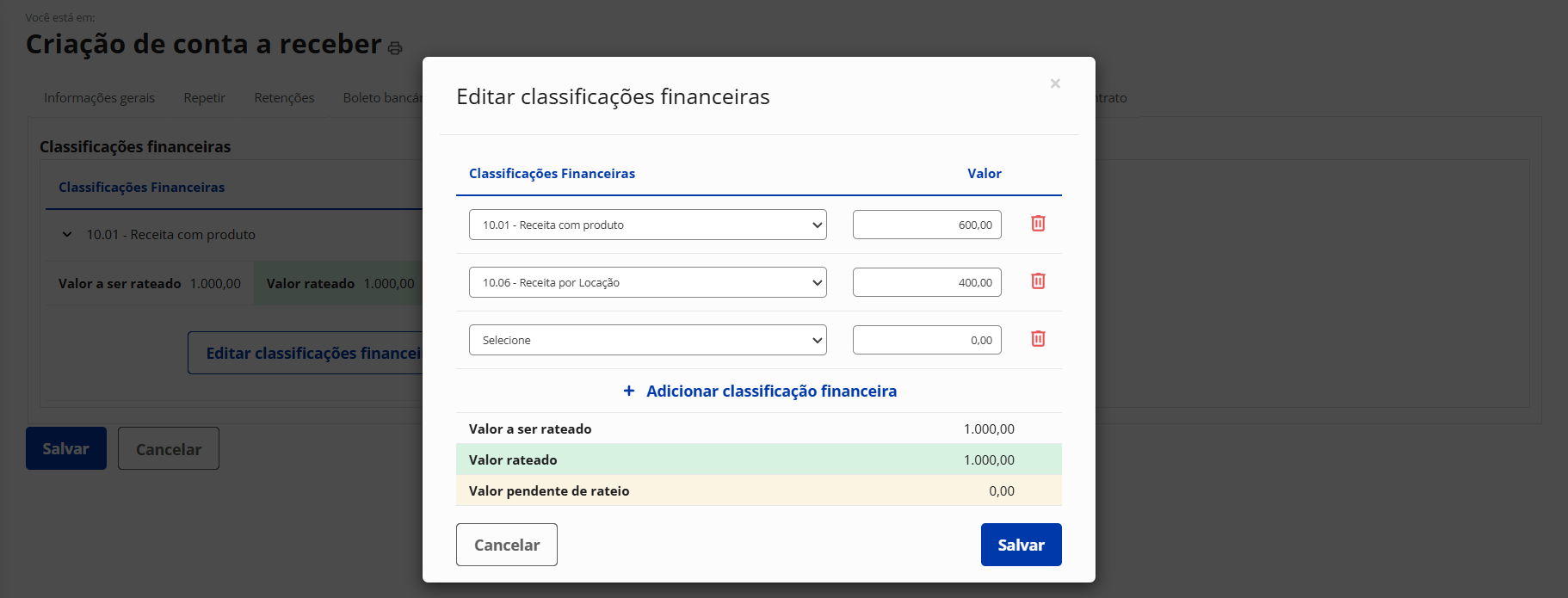 Multi classificações financeiras nas contas a receber e a pagar