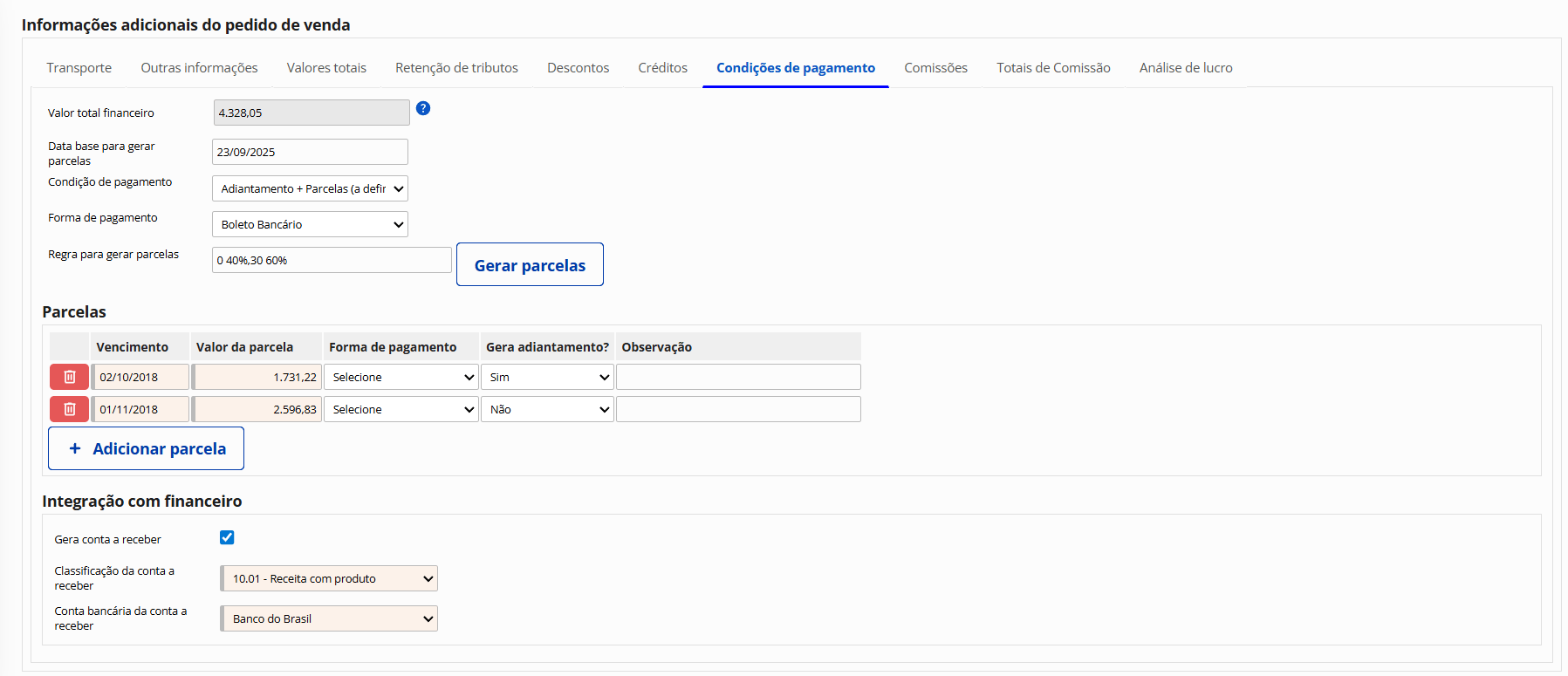 Criação de adiantamentos de clientes nos pedidos de venda ou diretamente no financeiro. Baixas automáticas por compensação com adiantamento de clientes na emissão da nota fiscal.