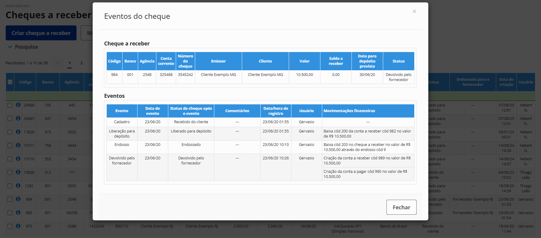 Gestão de cheques a receber