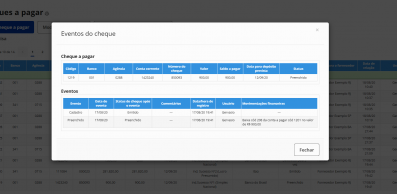 Gestão de cheques a pagar emitidos pela sua empresa para quitação de contas a pagar com controle de transações como depósito, primeira devolução, reapresentação e segunda devolução.