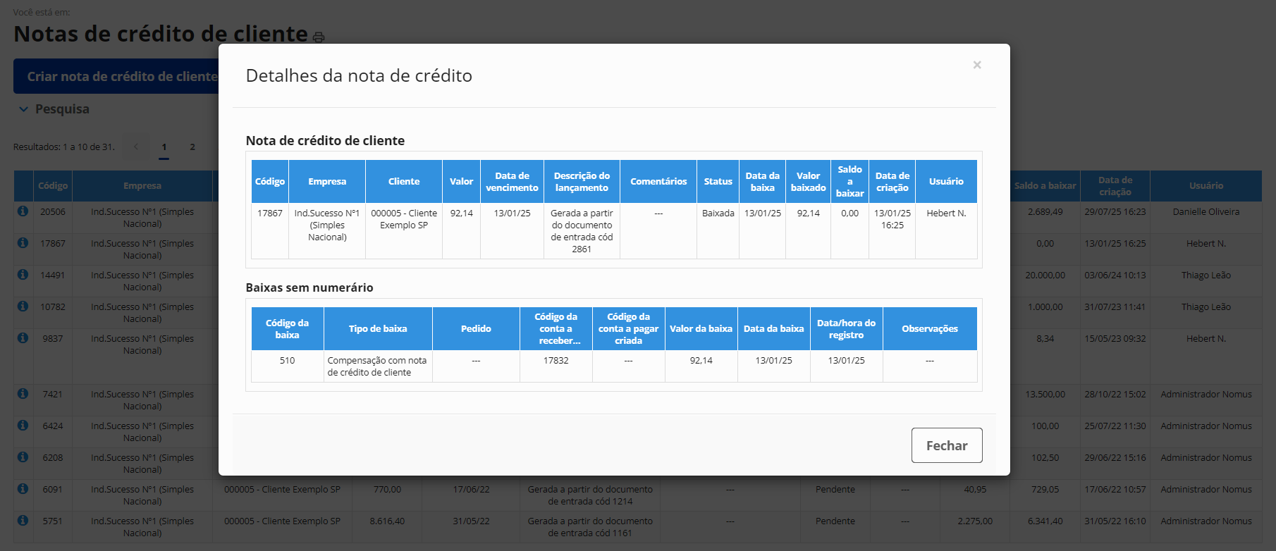 Geração de notas de crédito de clientes a partir de devoluções de venda ou livremente. Baixas sem numerário de contas a receber por compensação com notas de crédito de clientes
