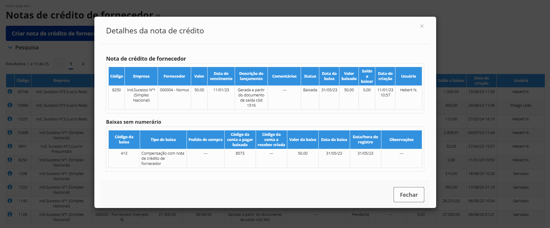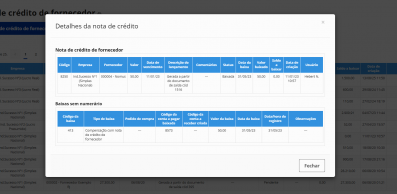 Geração de notas de crédito de fornecedores a partir de devoluções de compra ou livremente. Baixas sem numerário de contas a pagar por compensação com notas de crédito de fornecedores.