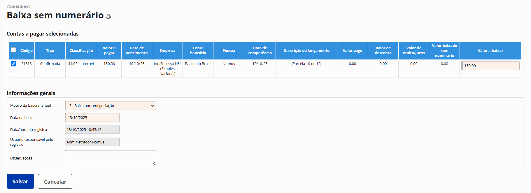 Registro das baixas sem numerário de contas a receber e a pagar com motivos personalizados pela sua empresa
