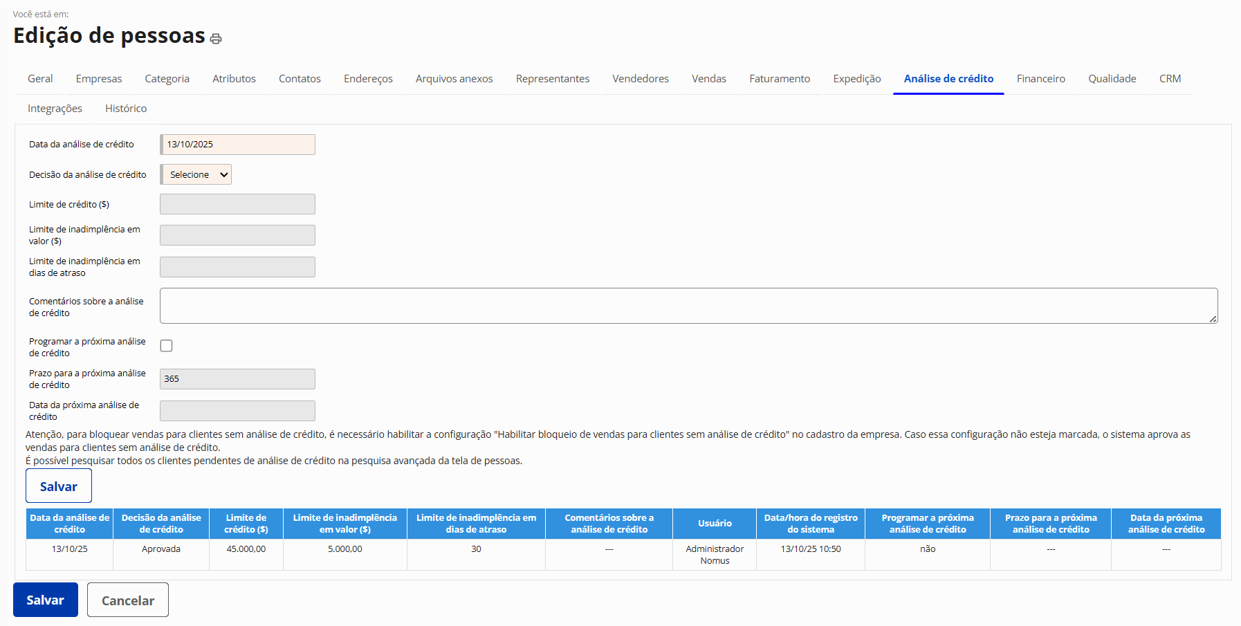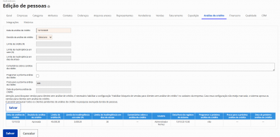 Análise de crédito de clientes com a possibilidade de informar limite de crédito, limite de inadimplência em valor e limite de inadimplência em dias de atraso. Possibilidade de bloquear a realização de vendas para clientes reprovados na análise de crédito.