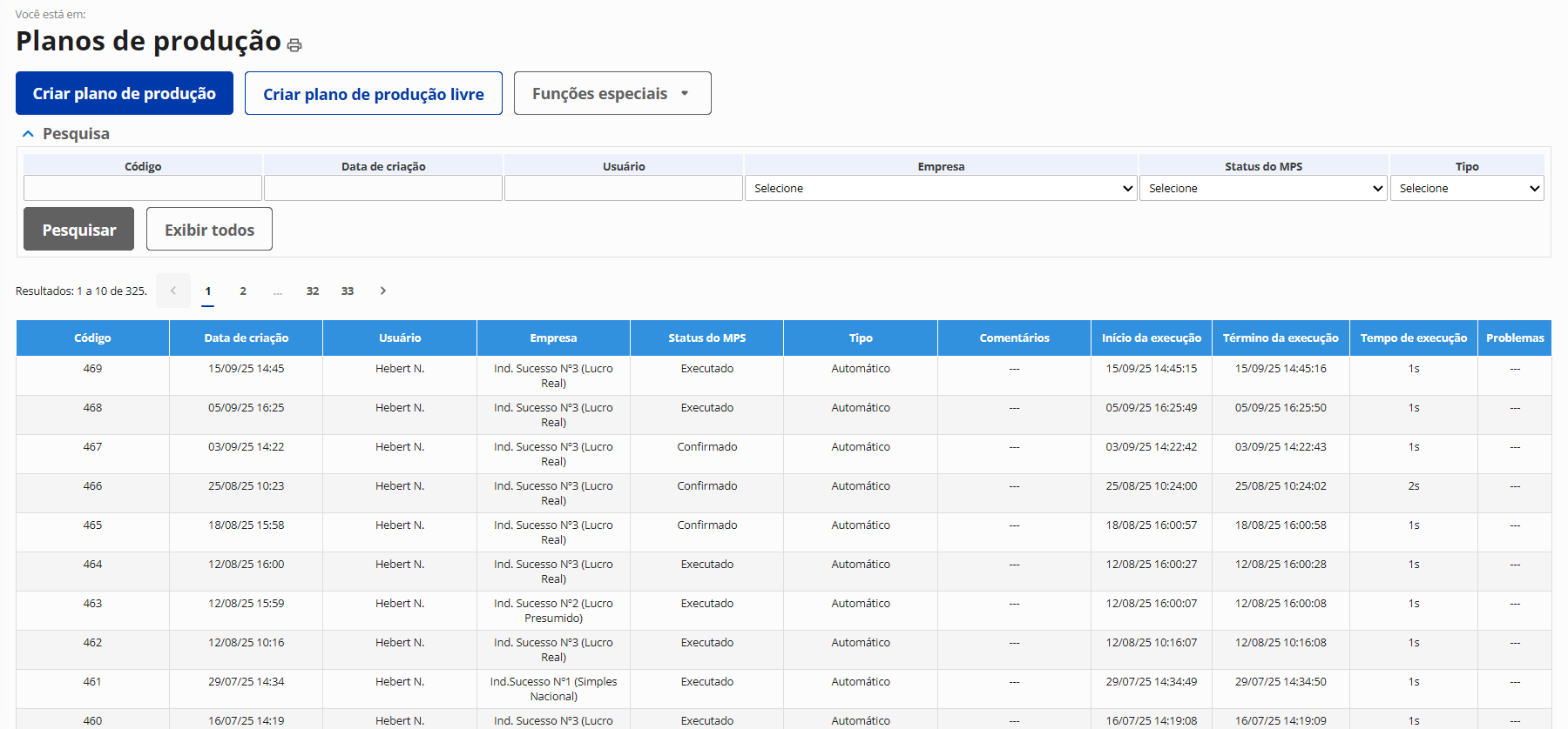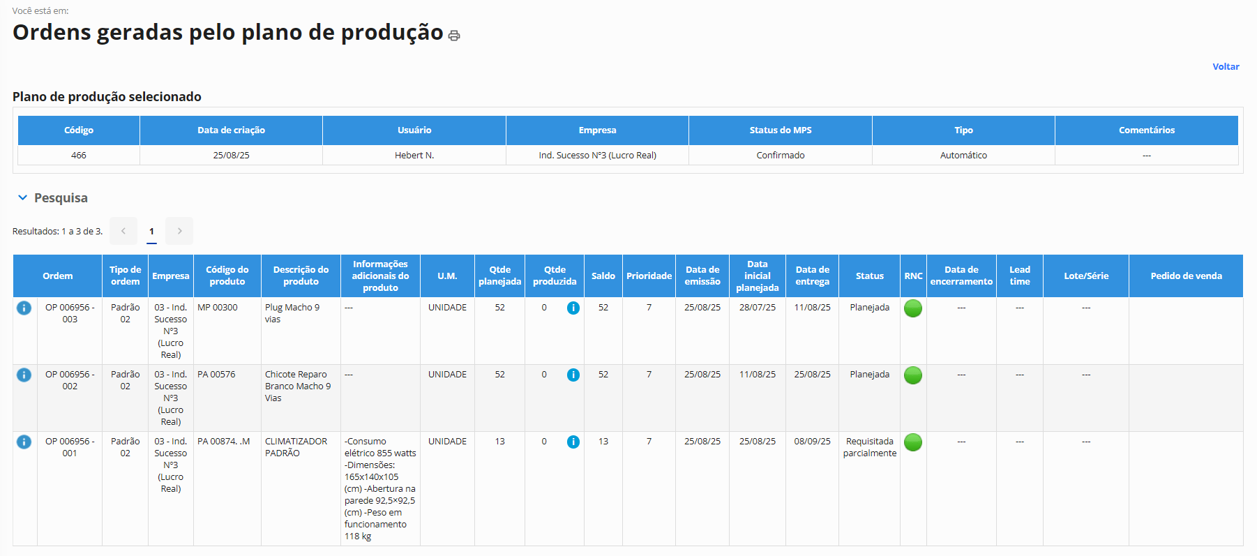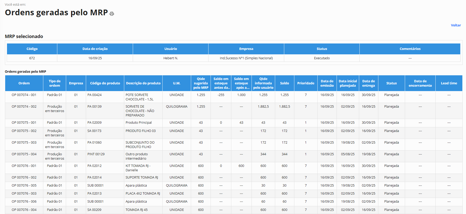 Geração automática de todas as ordens de produção sugeridas pelo plano de produção conferindo agilidade e precisão para o planejamento da produção.