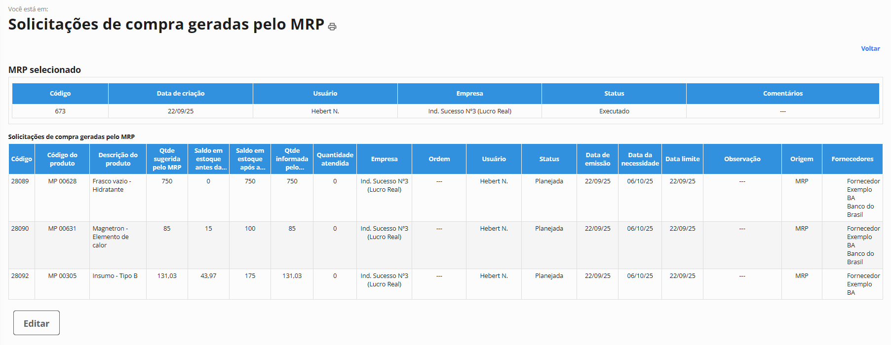 Geração automática de solicitações de compra de matérias primas sugeridas pelo MRP conferindo agilidade e precisão para o planejamento de compras.